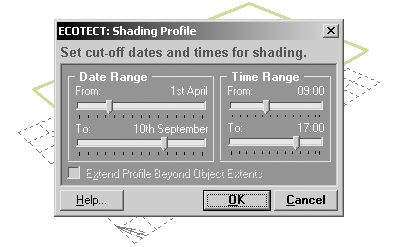 To do this, first locate the Transform Origin at one of the vertexes of the site polygon - any one will do to start with. The origin is shown as small red axis with X, Y and Z at the end of each line. Next, make sure that the large horizontal plane above the site is currently selected. Finally, select the Calculate > Shading and Shadows > Project Transform Origin > Solar Shading Profile menu item. This will display the dialog box shown in Figure 3.