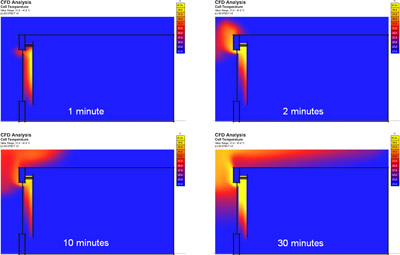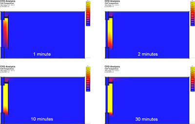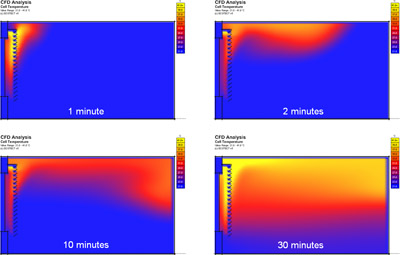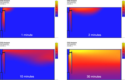 You can also see that, at around 30 minutes, the warmed air is sufficiently low within the room to start being drawn back through the gap at the bottom. This will lead to a whole new feedback loop that will further accelerate the heating of the room.