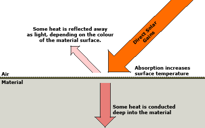 When solar radiation falls directly on a material’s surface, the incident energy acts to increase the surface temperature of the material. As it does this, the temperature differential between the material’s surface and the material immediately underneath it also increases. This results in a flow of heat from the surface deeper into the material itself. The rate of this heat flow depends upon the conductivity of the material.