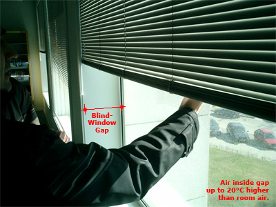 Once solar gains have passed through a window and hit an internal blind, they are already inside the space. Only if the blind surface is highly reflective and the solar rays redirected straight back out the window will this not result in some heat build-up. Thus, whilst the blinds may effectively block glare and daylight, conduction, convection and radiation will usually convey a large portion of the heat to the internal space.