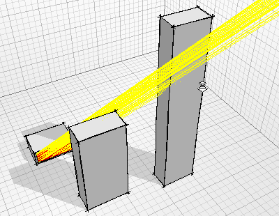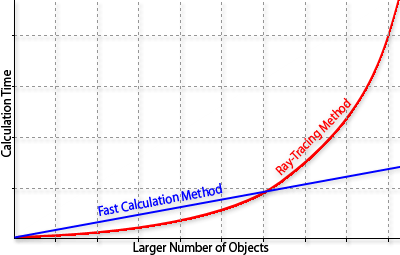 On relatively small models with rectilinear geometry, the Fast Calculation Method is not necessary and can even be slower than the ray-tracing method. However, the complexity of the ray-tracing method increases almost exponentially with the number of obstructing objects in the model whereas the fast calculation method is much more linear. The graph in Figure 12 illustrates the relationship between the two.