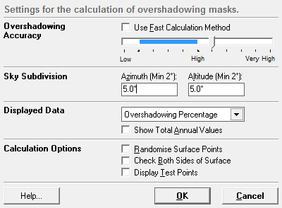 Overshadowing accuracy is one of the most important settings to get right. It basically controls the number of sample points used to calculate the partial shading of surfaces, varying from very low (a single point at the centre of the surface) to very high (a 100x100 grid giving a total of 100,000 points per surface). Obviously with so much variance, this value effectively determines how long each calculation will take.
