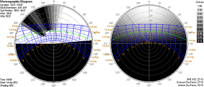 In large models with many complex faces, it is often much quicker to generate an entire overshadowing diagram for each object than it is to trace a ray out to each of the 1296 sky segments. From the overshadowing diagram, individual pixels within each sky segment can be tested to see it they are part of the shaded or non-shaded areas. By sorting and generating shadow colours based on transparency, this method easily accommodates transparent and translucent obstructions, but cannot as yet deal with reflection effects.