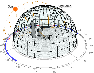 Now, rather than having to recalculate these rays every time the date or time changes, it is possible to pre-calculate shading effects for many different parts of the sky. Ideally only those areas of the sky through which the Sun passes would need to be calculated. However, to accommodate the obstruction of diffuse radiation, check for all possible reflections and to allow maximum flexibility to consider different options, it is more practical to cover the entire sky dome.