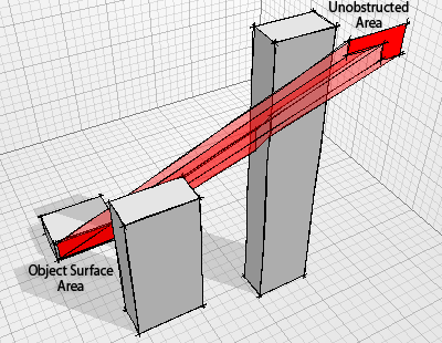 This works if the object is a point, but if it’s a large surface it might be only partially in shade. It is possible to test for this by performing a full view factor calculation - extruding the surface towards the Sun and ‘clipping off’ the bits that are obstructed by other objects along the way. The fraction of the object exposed to the Sun at that time is found by dividing the surface area of the resulting shape by the full surface area of the object. The percentage in shade is then simply any fraction left over.