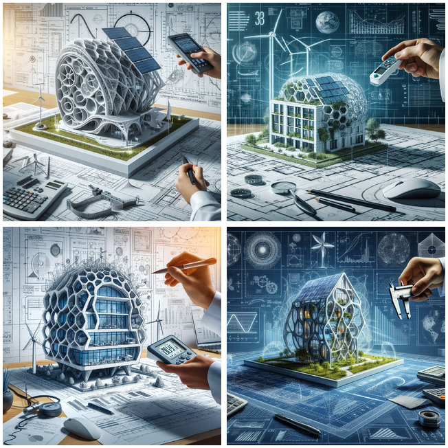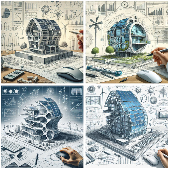 After I had a good range of hand-drawing style images for this website, I tried to get it to generate similar buildings but with the appearance of being assessed or measured. Again, it took a lot of fine tuning but it had a pretty good go as the examples in Figure 3 show. Whilst I absolutely loved them, I can see that they are probably a bit too cheesy and, apart from some pretty wild building shapes, don’t really add anything insightful. Thus, I ended up not using any of them.