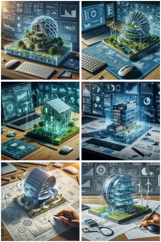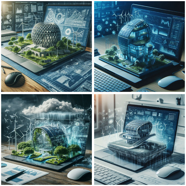 For my future BIM website, I wanted similar kinds of buildings but with their surrounding sites shown emerging from the keyboard of a laptop. Again, it took several rounds of iteration and feeding back in a lot of previously generated images, but you can literally see in Figure 4 that it gets better and better with each iteration. Unfortunately the model’s understanding of wind turbines still needs a bit of work.
