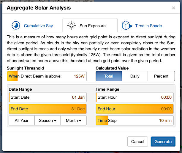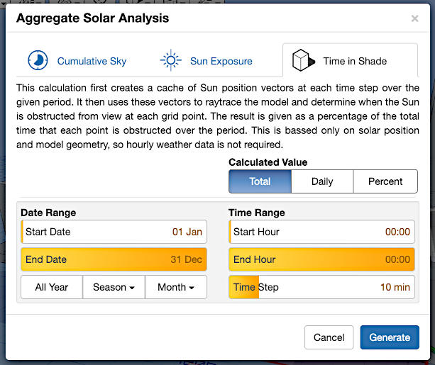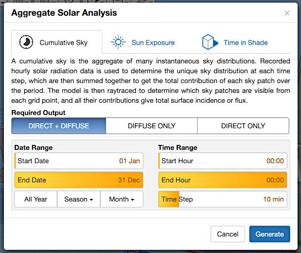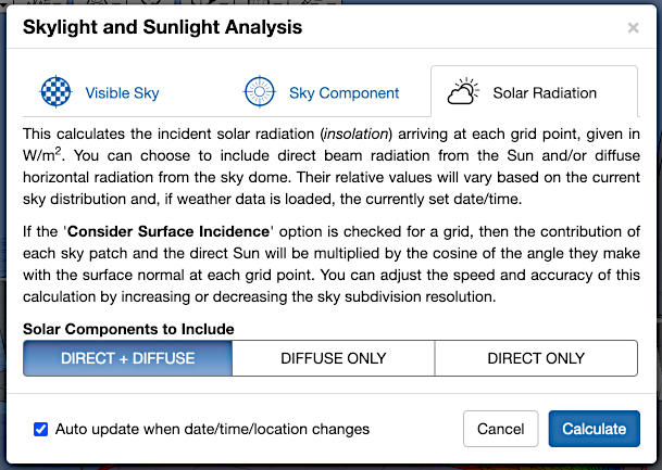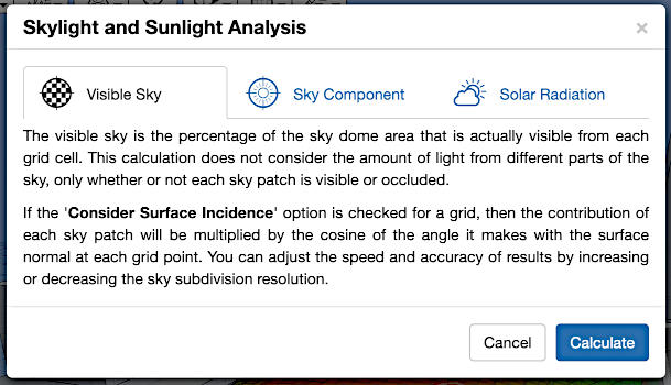 Another aim was to see if I could implement dynamic sky radiance/luminance mapping for use with the shading. The degree of shading at any point is usually quantified by the percentage of the sky that is occluded. However, the luminous distribution over the sky dome is typically quite uneven and varies significantly over short time periods. With this app, you can experiment with a range of different sky conditions and quantify shading based on the percentage of actual sky radiance that is occluded. When used with a cumulative sky (summed over a longer period), this allows you to clearly view seasonal variations.