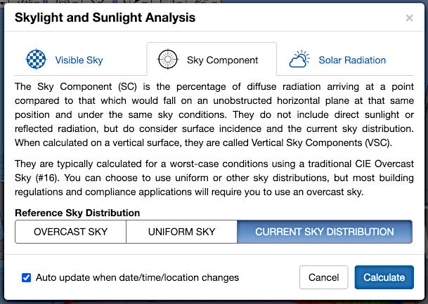 Overlaying the radiant distribution of the various CIE Standard General Sky types, simultaneously in both 2D and 3D, that update dynamically whenever the date, time or location changes,